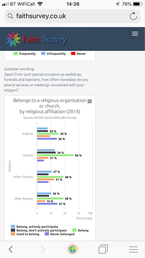 The new theology course for the Autumn began by looking at some of the contributing factors to the ongoing decline in Christian affiliation, in the United Kingdom. It is using the 1980’s series ‘The Sea of Faith’ which was written and presented by Don Cupitt and is a very useful tool for understanding the changes that have taken place. The aim of the course is to see how the church can re-engage with society and how the great treasures of our religion can be articulated to coming generations. Or, put more simply, to understand how to chat to our grandchildren about Jesus in a way that opens conversations not closes them!