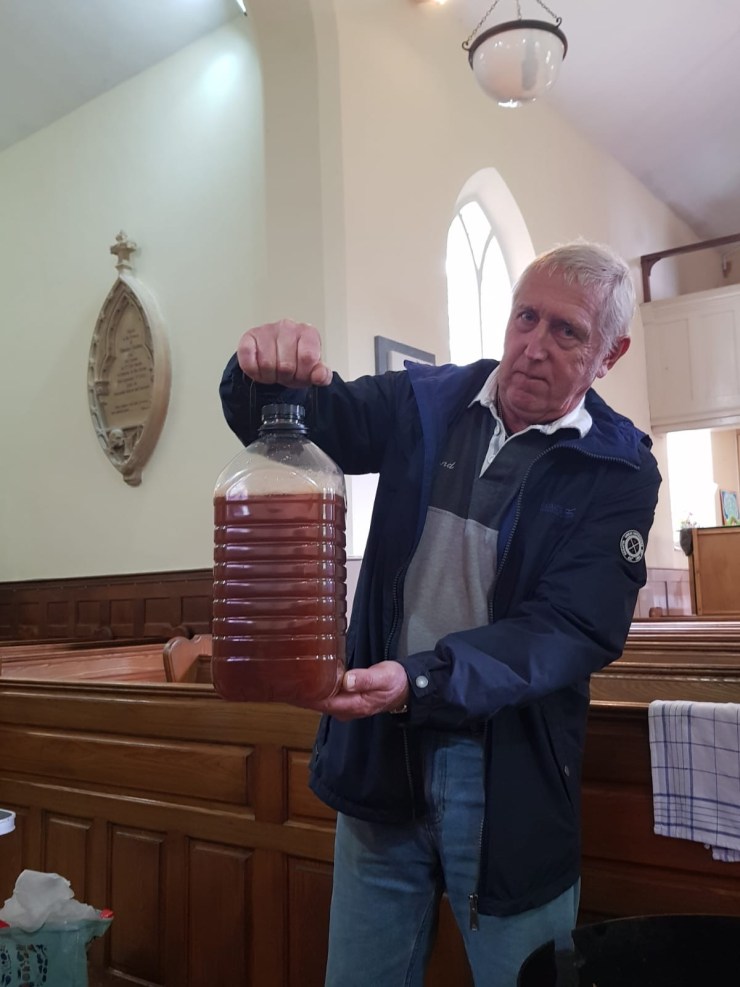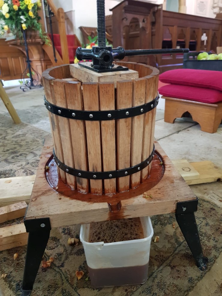 Pictures speak a thousand words and they show the process and the lovely community activity that it is. We all got a sense of how much manual activity (now all mechanized) was required to produce the juice that we take for granted. The physicality of the process and the realization that ‘many hands make light work’ was the essence of it all. I had been tempted to get a large press that is operated by water pressure and an electric scrattler, as I have seen it done this way at other community events. But we have decided that the manual scrattling and pressing is part of the joy of the activity. This year Colin, who came to the Brading pressing, made us the wonderful ‘scrattler stand’ that was a godsend at the St Helens day and next year I will buy another manual press as that is the slowest part of the process….. so yes there will definitely be a ‘next year’.