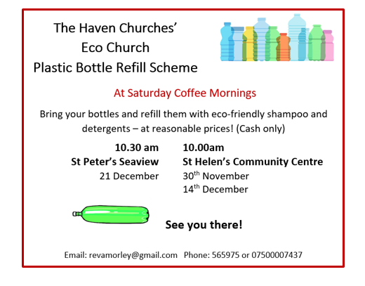 At this time of year it seems impossible to avoid plastic goods and packaging in the frenzy of Christmas shopping. In the Haven Benefice we have been cutting back on single-use plastic by refilling our plastic bottles of shampoo and detergent at the refill station, at the Saturday coffee mornings. You can bring your bottles along to St Helen’s Community Centre, at 10am tomorrow morning, for a refill.