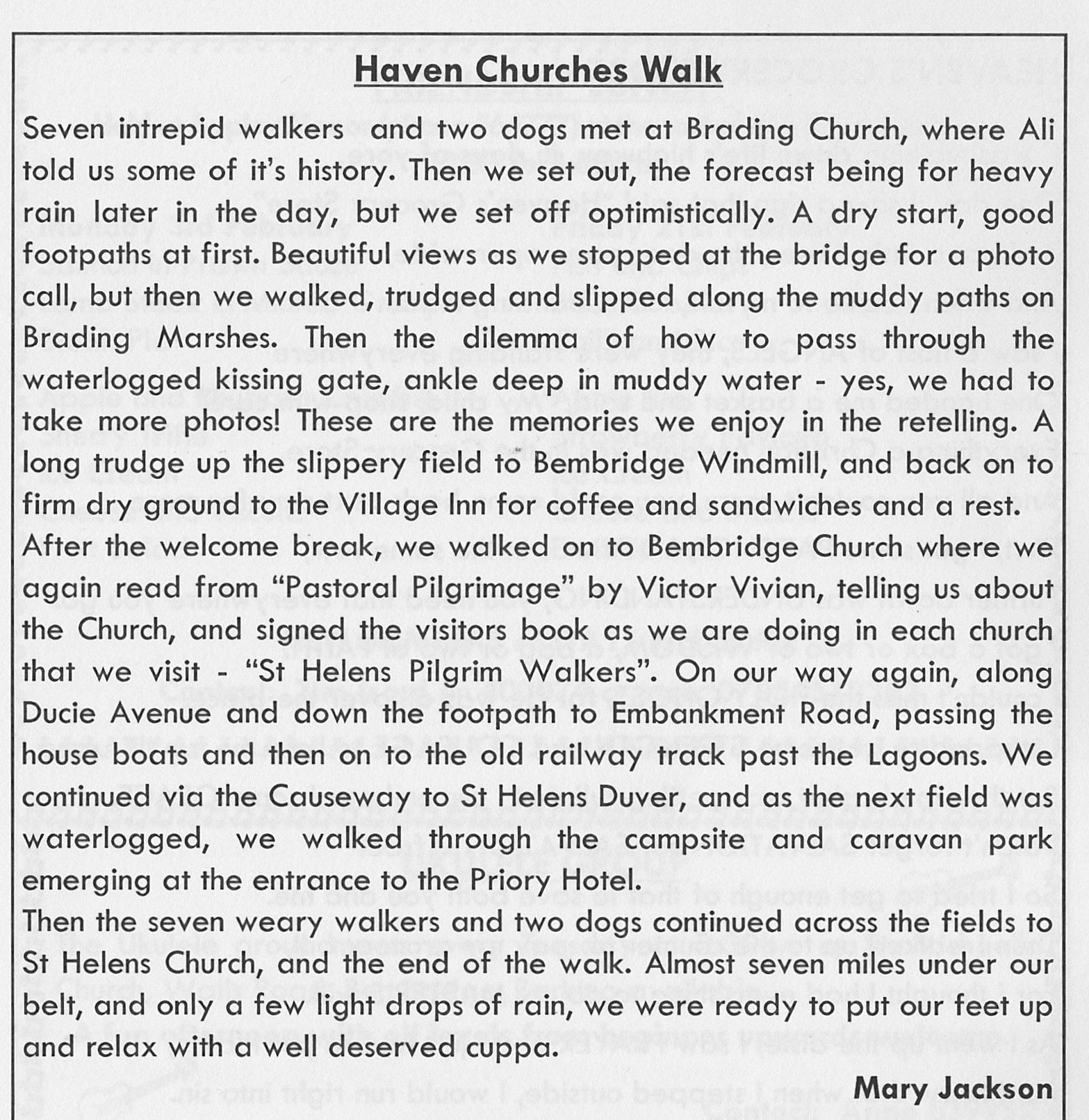Thursday 16th January, seven of us and two dogs, led by Ali, started our walk at St. Mary’s Church, Brading. Over Fatting Marshes, nestled in the beautiful valley of the lower River Yar, an important RSPB wetland. Then through Centurions Copse to the Windmill and into Bembridge, stopping at the Village Inn for coffee and picnic before visiting Holy Trinity Church. Round the harbour, up through Nodes Point holiday camp, and over the fields to the vicarage. An exhilarating and very muddy walk with much laughter and camaraderie. In spite of the cloudy and drizzly weather the churches and beautiful countryside were enjoyed by all.