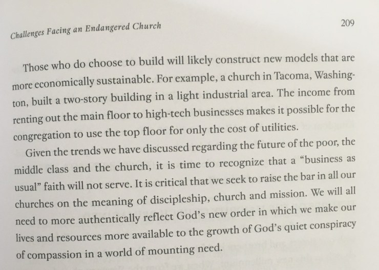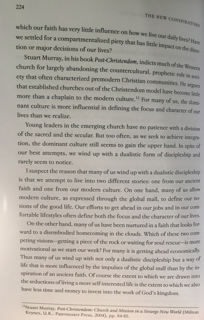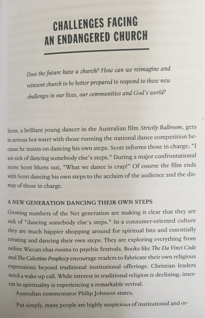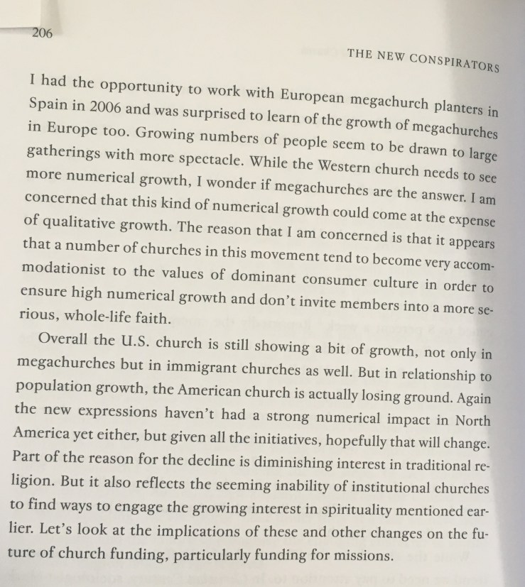 It is my opinion that over the last 12 years since this book was published what has actually happened is not so much a re-imagining as the rolling out of a one size fits all evangelical model for growth that has led to fairly unimaginative church refurbishments, the introduction of technology to entertain, 80’s pop music rhythms and neatly packaged culturally safe consumption in worship. There are interesting things happening outside mainstream churches but on the whole the movement has been towards, ‘cappuccino, comfy chairs and a worship experience that gives a fuzzy glow’.