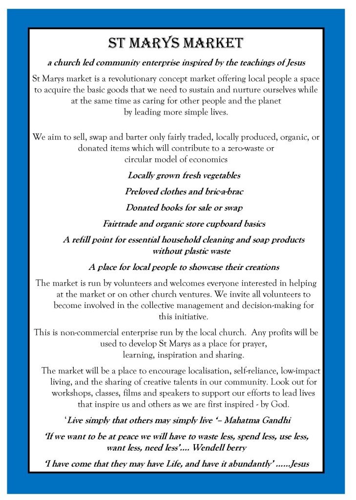 ‘A revolutionary concept market offering local people a space to acquire the basic goods they we need to sustain and nurture ourselves, while at the same time caring for other people and the planet by leading more simple lives’ . It is a church led community enterprise inspired by the teachings of Jesus. … it is also hard to explain so come and see us and if you have clothes or useful bits or books to donate we would love them. See you there Ali x